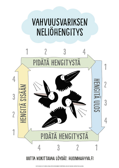 Vahvuusvariksen itsesäätelyoppaassa Varis ystävineen leikkii ja oppii tutuissa ympäristöissä. Itsesäätelyä harjoitellaan kotona, ryhmässä, pihalla ja ruokapöydässä, kaikkialla, minne varpaat vievät. Välillä hermostuttaa, välillä pitkästyttää ja välillä ujostuttaa, eikä linnuiksi oleminen ole aina helppoa.