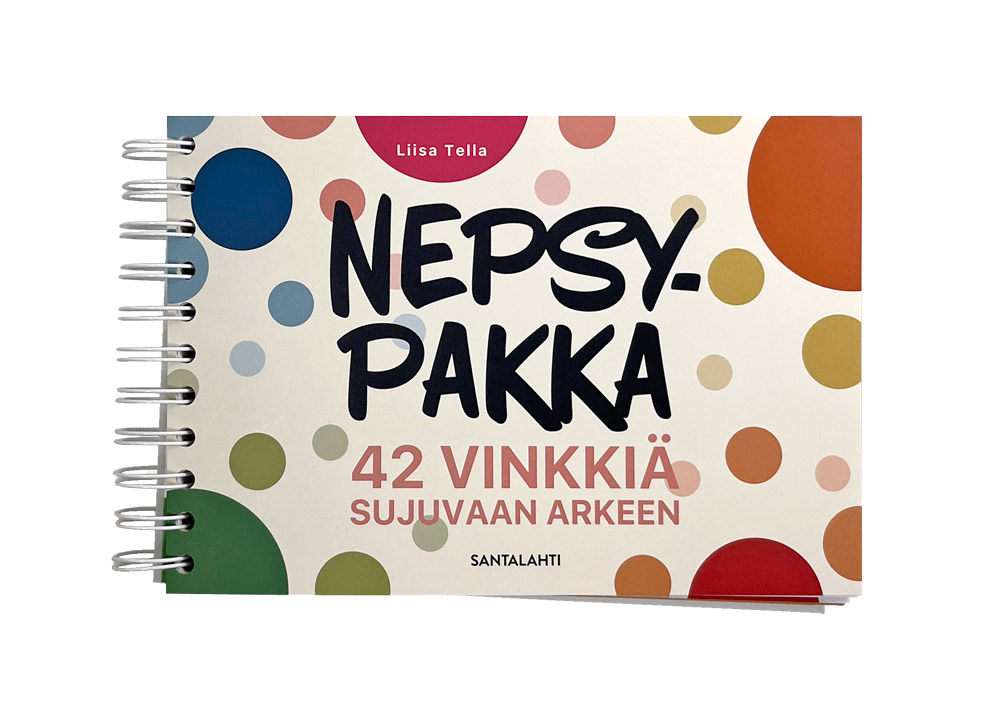 Nepsypakka on toteutettu kierrevihkona, jonka sivut voi halutessaan irrottaa yksittäisiksi korteiksi. Jokaisessa kortissa on yksi selkeä ja käytännönläheinen vinkki arjen opetustilanteisiin.