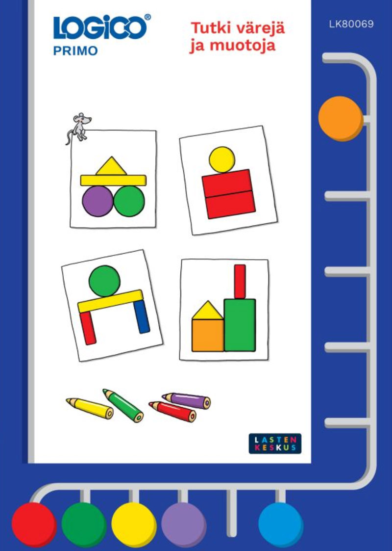 Logico Primo Tutki värejä ja muotoja -tehtävissä tutustutaan väreihin ja muotoihin, sarjoittamisen alkeisiin sekä hahmotetaan rakennelmia